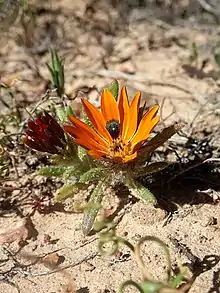 Gorteria is a genus of small annual herbaceous plants or shrubs, with 8 known species, that is assigned to the daisy family (Compositae or Asteraceae). Like in almost all Asteraceae, the individual flowers are 5-merous, small and clustered in typical heads, and are surrounded by an involucre, consisting of in this case several whorls of bracts, which are merged at their base. In Gorteria, the centre of the head is taken by relatively few bisexual and sometimes also male, yellow to orange disc florets, and is surrounded by one complete whorl of 5–14 infertile cream to dark orange ray florets, sometimes with a few ray florets nearer to the centre. None, some or all of them may have darker spots at their base. The fruits remain attached to their common base when ripe, and it is the entire head that breaks free from the plant. One or few seeds germinate inside the flower head which can be found at the foot of plants during their first year. The species flower between August and October, except for G. warmbadica that blooms mostly in May and June. The species of the genus Gorteria can be found in Namibia and South Africa.[2]
