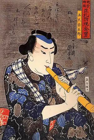 Woodblock print of Goshaku Somegoro playing shakuhachi, by Utagawa Kuniyoshi