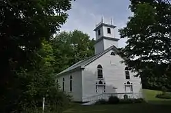 The Goshen Church is located in a rural upland area of western Bradford, on the east side of Goshen Road a short way south of its junction with Upper Rogers Road. It is a single-story wood-frame structure, with a gabled roof and clapboarded exterior. Its front facade is symmetrical, with two identical entrances, each framed by sidelight windows and topped by a triple tympanum with a central Gothic louver flanked by smaller similar ones. Above each entry is a sash window, also topped by a Gothic louver, and a similar opening, now sided over, is set in the gable end. A two-stage square tower rises from the roof ridge, with a plain first stage, and a smaller second belfry stage with rectangular louvered openings. The tower is topped by a railing with corner pinnacles. The interior retains original box pews and pulpit, the latter finished in a simulation of marble.[2]