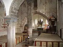 The church also incorporates a choir bench from the first half of the 14th century and a church bell from 1374; otherwise, most of the furniture is later, Baroque in style.[1][2]