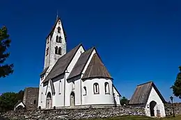 The church has a tall and slender western toward which contains a single bell, built by the Gothic builder workshop known by its notname Egypticus, which was active on Gotland during the time period 1330-1380.[3] The nave is divided into two by a single column, and the choir ends in an apse. During a restoration in the 1950s, medieval murals were uncovered. They now again completely dominate the interior of the church. They are partly designed as imitations of drapery and tapestries, and partly depict biblical scenes and other figures (including knights and footmen fighting). They date from c. 1300 and were probably executed by an anonymous German artist.[1][2]