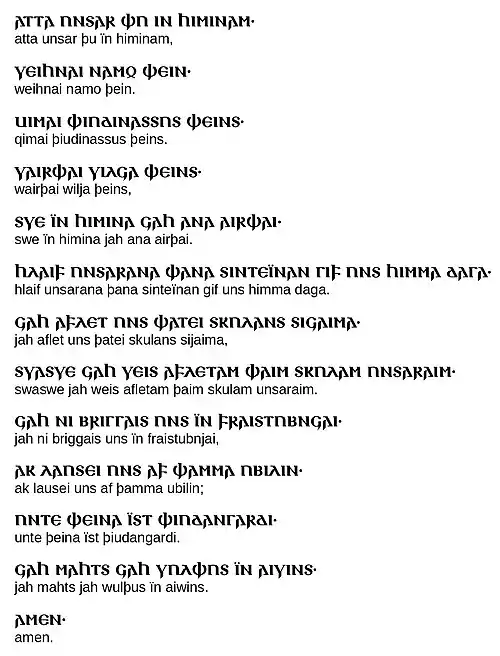 Text of The Lord's Prayer in the Wulfila Bible, with transliteration