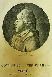 Gottfried Christian Voigt (1740–1791, pronunciation [foːkt]) was an 18th-century German law clerk of Quedlinburg, scholar and antiquarian, author of a 1791 "History of Quedlinburg Abbey" (Geschichte des Stifts Quedlinburg).