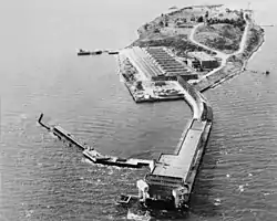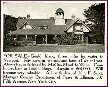 A lighthouse was built on the island in 1889 which was demolished in 1960. Richard L. Howell purchased the island in 1909, and his daughter and son-in-law Percy D. Haughton inherited it along with the McKim, Mead, and White house. Percy Haughton was Harvard College's football coach, and he used the island for training the football team.[1]