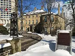 A fire erupted in the mansion's attic in 1854; however, the blaze was kept under control due to the fireproofing precautions taken during the design and construction of the edifice. Government House was not well maintained in the latter half of the 20th century. As one of the oldest official residences in Canada, Government House was designated a National Historic Site of Canada in 1982.[7] The following year, the provincial government, under the Heritage Property Act, listed the house and its gardens as a Provincially Registered Property, in recognition of its Georgian architecture and its association with the various lieutenant governors since 1805 and the Canadian monarchy.[8] The property was not well maintained, regardless, and it underwent extensive renovation and restoration for three years prior to the end of 2008;[5] the building was rededicated by Queen Elizabeth II on 28 June 2010.[3][9] At the same time, a new Royal Key was inaugurated; it was presented to the Queen and then returned at the end of her tour of Canada, so as to be granted to future lieutenant governors.[9] Nova Scotia's Government House is presently the oldest viceregal residence in North America.[5]