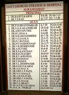 Government Medical College, Aurangabad is a medical school affiliated to the Maharashtra University of Health Sciences (MUHS), Nashik.[2] The College is recognized by the Medical Council of India (MCI), New Delhi for medical education in India.[3] It was founded in 1956. At present, the college accepts 200 students per year for the undergraduate course MBBS and around 127 students per year for the various postgraduate courses.[4]
