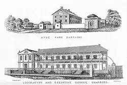 The court first sat in May, 1815.[3] Macquarie appointed Richard Brooks and Charles Hook as respectable persons to sit with Bent on the new Court.[4] Bent, being under the influence of his brother Jeffery Hart Bent, had Brooks and Hook unanimously adopt a rule that no attorney who had been struck off the roll of lawyers should be admitted to practise before the court.[4] This was to lead to a falling out between Bent and Macquarie over the status of emancipated convicts. The rule was particularly onerous as there were no attorneys in the colony who hadn't arrived there as convicts. As each convict attorney had been struck off the roll, effectively there was no attorney who could appear in the court. The court later sat with Frederick Garling as acting deputy judge advocate after the death of Bent. Sir John Wylde was appointed by the British authorities in 1815 as Bent’s successor and presided in the Court until its abolition in 1823. From about 1817, the court also sat twice a year outside Sydney. New South Wales State Archives records show that the court at least sat at Parramatta and Windsor for the trial of causes.[5]