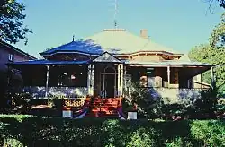 The core of this brick house has a symmetrical front facade; a central entrance porch separating bay windows which extend through the veranda roof and are surmounted by a finial. The steep hipped corrugated iron roof rises to a lace-trimmed widow's walk.[1]