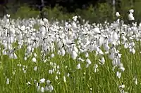 The phytocenoses of the open type are dominated by species inherent in moist meadows, especially those that do not require fertile soils. The species of these habitats are formed by common cottonsedge (Eriophorum angustifolium) and broad leaved cotton grass (Eriophorum latifolium), as well as various specimens of sedge grass (Carex): black sedge (Carex nigra), club sedge (Carex buxbaumii), silvery sedge (Carex canescens), woollyfruit sedge (Carex lasiocarpa), oval sedge (Carex leporina), carnation sedge (Carex panicea), tawny sedge (Carex hostiana) etc. Among these herbs are impurities of unpretentious grass (Poaceae) - blue moor-grass (Sesleria caerulea), purple moor-grass (Molinia caerulea), purple small-reed (Calamagrostis canescens). They are joined by representatives of weeds, among which the most common are common marsh bedstraw (Galium palustre), devil's-bit scabious (Succisa pratensis), marsh marigold (Caltha palustris), buckbean (Menyanthes), marsh cinquefoil (Comarum palustre), marsh hog's fennel (Peucedanum palustre) and to a lesser extent yellow iris (Iris pseudacorus), marsh lousewort (Pedicularis palustris), tufted loosestrife (Lysimachia thyrsiflora). Of the shrubs in the meadows common rosemary leaved willow (Salix rosmarinifolia).[10] Interestingly, the purple moor-grass (Molinia caerulea), both in forests and meadows, forms the characteristic rounded mounds.[4]