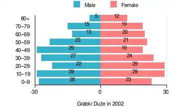 According to the 2002 Poland census, there were 387 people residing in Grabki Duże village, of whom 49.4% were male and 50.6% were female. In the village, the population was spread out, with 25.1% under the age of 18, 36.2% from 18 to 44, 19.4% from 45 to 64, and 19.4% who were 65 years of age or older.[1]