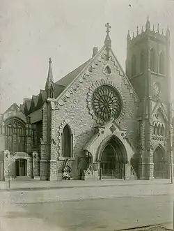 In 1851, parishioners from Chicago's oldest Episcopal congregation, then about a decade old, Trinity Episcopal Church[4] helped found Grace Episcopal Church in the developing downtown district, which is now known as the Chicago Loop. The first building, a wooden structure, was at Dearborn and Madison Streets, and its first rector, Rev. Cornelius F. Swope, served until 1854. In 1859, the Rev. Clinton Locke became rector, and mostly served in a building at Wabash Avenue and East 8th Street and later at Wabash between 14th and 15th Street, while its parent Trinity Church moved to Jackson street between Michigan Avenue and Wabash by 1860. The Great Chicago Fire in 1871 destroyed both churches, as well as much of the city. That third Grace Church building burned down in 1915, so the congregation rebuilt the partially damaged parish house nearby, and used it for a decade. In 1929, the congregation moved to a new building at 1450 South Indiana Avenue, near St. Luke's Hospital, with which some were associated. The congregation returned to the Loop when it dedicated its fifth building, at 33 West Jackson in 1966.