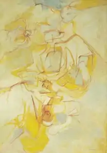 In 1951, Renzi went to Cuba and stayed there one year. While teaching, she discovers the island and mingled with the arts community, thus meeting Wifredo Lam and his artistic universe. The first solo exhibition of Renzi's work took place in Havana, followed by another one in 1952.[1] Back to New York and having gotten over hepatitis, she teaches again to finance her trip to Europe. She arrived in Paris in September 1953 and got to know the artistic milieu of the time. In Montparnasse, Renzi met the Slovenian composer Božidar Kantušer who became her husband.[2] The couple moved to the République quarter. In 1955, their son Borut was born. That same year, Renzi participates in a group exhibition at the Galerie du Dragon, her first exhibition in Paris. During the winter of 1956–57, Renzi went to New York after her mother died. In 1957, back in France and in order to support the family, she took a full-time job in a U.S. Army school in Bordeaux. The first solo exhibition in Europe of Renzi's works took place in Bordeaux.[3] In 1958, Renzi exhibited in Paris at the gallery L'Antipoète, notably alongside Jean-Michel Atlan, Jean Fautrier, Hans Hartung, Serge Poliakoff and Sigismond Kolos-Vary. At the end of 1958, the family moved to Fontainebleau, where Renzi continued with her teaching job.