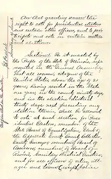 The passage of the Illinois Suffrage Act (also known as the Illinois Law)[24] was a turning point for suffrage. It gave women in Illinois suffrage for township officials and presidential electors, increasing the presidential electors women could now vote for from 37 to 54.[11] Although it was limited, not full suffrage, its effect was significant. It helped women in New York gain suffrage, and that success was a significant precursor toward full suffrage through the nineteenth amendment. National suffrage leader Carrie Chapman Catt wrote that "the effect of the Illinois victory was ‘astounding’ and that ‘suffrage sentiment doubled over night’ as a result.”[25]