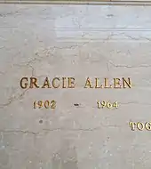 Burns' remains were interred at her side in 1996 when he died at the age of 100. The marker on the crypt was changed from "Grace Allen Burns—Beloved Wife And Mother (1902–1964)" to "Gracie Allen (1895–1964) and George Burns (1896–1996)—Together Again".[22]