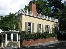 The merchant Archibald Gracie, at the time one of New York City's richest men,[24] bought Walton's land in two phases in December 1798 and January 1799.[25][21] At the time, the Gracies' city residence was a house that they rented from New York City mayor Richard Varick.[26][27] Gracie built a new country estate on the Walton site in 1799,[28][29][30] though there is disagreement over whether Gracie reused the remains of Belview Mansion or destroyed the older house altogether.[15][31][lower-alpha 1] In either case, Gracie removed the Revolutionary War-era earthworks and landscaped the gardens.[33] Gracie's mansion was abutted to the west by the house of banker Nathaniel Prime,[34][35] which later became St. Joseph's Orphan Asylum.[35] There were various other houses along the East River,[36] including those of the Rhinelander family,[34] Alexander Hamilton, John Jacob Astor, and Isaac Chauncey, which have long since been demolished.[37] Gracie Mansion, at the time, was accessible only via the East River and was several miles from the developed parts of Lower Manhattan.[30][33] A large tree stood on the grounds, along the bank of the East River.[18][38] There was a dock and a stone stable just south of the house.[38]