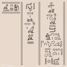 Mandulis was one of these Nubian deities that were also worshipped throughout Egypt.[1] Mandulis was relatively prominent, and was seen at least in southern Egypt as a son of the god Horus. Greek and Roman travellers and authors saw Mandulis as a form of the Greek god Aion.[7] Due to its geographical location, it is unclear whether Philae was staffed by Egyptians or Nubians.[8] As can be gathered from the inscriptions, they were written by a priest of Isis named Nesmeterakhem.[1] Nesmeterakhem was at least a third-generation priest of the temple, his father Nesmeterpanakhet and his grandfather Pakhom also having been priests at Philae.[4] In the inscriptions, Nesmeterakhem is described as "Scribe of the House of Writings", significant since it demonstrates that he worked with the sacred writings (i.e. hieroglyphs).[1] Traditionally, hieroglyphs were seen as the actual writings of the gods.[9]