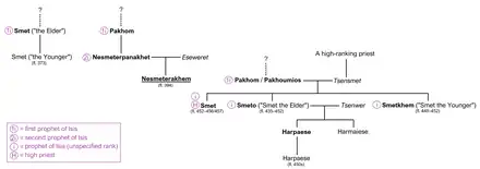 Reconstructed family tree of the "Smet" family, to which many of the late writers of inscriptions at Philae, including Nesmeterakhem (underlined), belonged. Some figures of uncertain association are omitted.