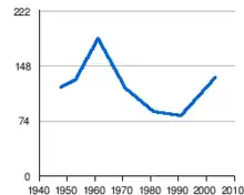 During Yugoslavia, Its population was the highest in 1953, Following censuses showed a consecutive decrease in its inhabitants. Most of the population started to slowly leave the area and most notably a stream of emigration followed with the 1979 Earthquakes of Montenegro.[38]