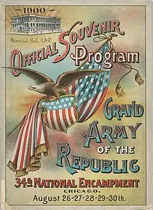 The GAR reached its largest enrollment in 1890, with 410,000 members.[18] It held an annual "National Encampment" every year from 1866 to 1949. Interesting anecdotes from the war were told around the many campfires at these reunions and compiled in a book of campfire "chats", including descriptions of the festivities at the 1884–1886 encampments in Minneapolis, Portland, Maine and San Francisco.[19] At the final encampment in Indianapolis, Indiana, in 1949, the few surviving attendees voted to retain the existing officers in place until the organization's dissolution. Theodore Penland of Oregon, the GAR's Commander at the time, was therefore its last.[3] At the time of the last national encampment, 16 members were still living and six were able to attend, including James Hard, the last combat veteran, who had fought at First Bull Run, Antietam, and Chancellorsville.[20] In 1956, after the death of the last member, Albert Woolson, the GAR was formally dissolved.[3]