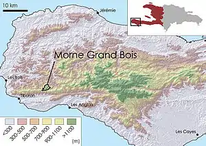 Grand Bois National Park (French: Parc National Naturel de Grand Bois, Haitian Creole: Gran Bwa Pak Nasyonal) is a national park in Haiti. It was established on September 23, 2015, by Haitian president, Michel Martelly.[1] The park is located in southwest Haiti, northwest of Les Anglais and it includes all areas on the mountain Morne Grand Bois of 900 meter elevation and higher. Morne Grand Bois sits directly on the border between the Sud department and the Grand'Anse department. Its highest peak is 1262 meters in elevation. Morne Grand Bois is an isolated mountain with remnant original (primary) rainforest.[2]