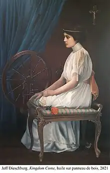 Kingdom Come by Jeff Dieschburg is a portrait of the Grand Duchess Marie-Adélaide of Luxembourg. The painting juxtaposes its historical figure with the character of Gretchen, from Goethe's Faust.