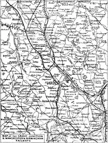 The Grand Junction Railway Company was established in the second half of 1832 by the consolidation of two rival companies: the Birmingham and Liverpool Railway Company and the Liverpool and Birmingham Railway Company.[1] Authorised by Parliament on 6 May 1833[2][3] and designed by George Stephenson and Joseph Locke, the Grand Junction Railway opened for business on 4 July 1837,[4] running for 82 miles (132 km) from Birmingham through Wolverhampton (via Perry Barr and Bescot), Stafford, Crewe, and Warrington, then via the existing Warrington and Newton Railway to join the Liverpool and Manchester Railway at a triangular junction at Newton Junction. The GJR established its chief engineering works at Crewe, relocating there from Edge Hill, in Liverpool.[5]