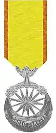 The medal pendant is made of silver. It is a crescent moon with the inscription Gagah Perkasa. Within arc of the moon is a fourteen-pointed star. An intricately designed clasp attaches the pendant to the ribbon. The medal's ribbon is royal yellow 1.5 inches wide with red stripes 1/8 inches wide.[6]