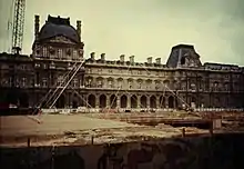 Work on the first phase of the project started with extensive archaeological excavations, which complemented earlier campaigns that had uncovered parts of the Medieval Louvre in 1866[7] and 1882[8] and revealed unfinished 17th-century works in front of the Colonnade in 1964.[9] The excavations were led by Michel Fleury and Venceslas Kruta in the Cour Carrée (1983–1985), by Pierre-Jean Trombetta and Yves de Kisch in the Cour Napoléon (1984–1986), and by Paul Van Ossel in the southwestern section of the Carrousel Garden (1985–1987). A later campaign in the central and northern sections of the Carrousel Garden took place in 1989–1990.[10] In parallel to the excavations in the Cour Carrée, the façades around the square were renovated and the new space was inaugurated on 26 June 1986.[11]