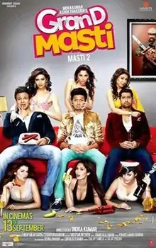 Grand Masti (transl. Grand fun), also referred to as Masti 2, is a 2013 Indian Hindi-language sex comedy film directed by Indra Kumar and produced by Ashok Thakeria. The film is a sequel to the 2004 film Masti, and the second installment of Masti (film series). It features Riteish Deshmukh, Vivek Oberoi and Aftab Shivdasani reprising their roles from the original, yet the film does not continue and is a new installment. The film also stars Bruna Abdullah, Karishma Tanna, Sonalee Kulkarni, Kainaat Arora, Maryam Zakaria and Manjari Fadnis.[1]