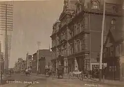 Opened in 1874 on Adelaide Street West, west of Yonge Street, the Grand Opera House was Toronto's premier concert hall during the late 19th century.[1] Designed in the Second Empire style with 1750 seats, the hall was the first in the city to feature gaslights that could all be switched on or off simultaneously with one electric switch. The Grand Opera House's stage hosted some of the era's best-known performers, including actors Maurice Barrymore, Sarah Bernhardt and Sir Henry Irving, soprano Emma Albani, as well as Italian baritones Giuseppe Del Puente and Antonio Galassi.[2][3] Visiting lecturers included Oscar Wilde.[4] During its initial years, the Grand Opera House was managed by Charlotte Morrison, a former actress, and the guiding force at that time behind Toronto's opera and theatre scenes. Morrison has been described as the "Ed Mirvish of her time".[2]