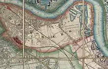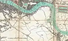 The Grand Surrey Canal was authorised by an Act of Parliament obtained on 21 May 1801, which created the Company of Proprietors of the Grand Surrey Canal, and gave them powers to raise £60,000 by issuing shares, and an additional £30,000 if required. They were authorised to build a canal from Rotherhithe, on the River Thames, to Mitcham in what was then Surrey, with branches to any places within 1,500 yards (1,400 m) of the main line.[2] Branches to Deptford, Peckham, the Borough, and one to rejoin the Thames at Vauxhall were included, but proposals for a branch from Mitcham to Croydon, and another to Kingston, which would have created a route to bypass the Thames through London, were removed from the bill during the committee stages. Those who opposed the canal ensured that clauses restricting use of water from the Wandle were inserted.[3]