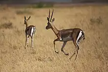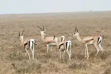 Grant's gazelles are generally mixed feeders that both browse and graze. In one study, their diet consisted of 66% browse and 34% graze.[17] Rainfall seems to be a determinant of their diets.[17] One way the Grant's gazelle withstands dehydration and heat stress is by being very efficient in digesting dry matter. Grant's gazelles consume a smaller amount of food than domesticated animals, but they are better-suited for extreme environments because they derive protein from forage more quickly.[18] The Grant's gazelle's diet may be responsible for the slow growth rates of browsed plants.[19] They get most of their moisture from the plants they eat, so they do not often have to drink water. Thus they can stay on the plains long after the rains end. In dry seasons, gazelles move deep into dense brush and wait for the next rains.[13] They will eat red oat grass and small, tough plants,[20] which are avoided by the other ungulates. This allows the gazelles to survive in the brush during the dry season. Grant's gazelles eat mainly dicotyledons during the dry season and grass in the wet season.[21]