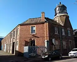 The lighthouse tower was never an operational lighthouse; rather, it was used to test lamps and equipment.[4][8] In 1869, the engineer John Richardson Wigham was invited to demonstrate an experimental gas lighting technique at the depot.[9] In 1892, a coal gasworks was constructed at the depot to produce the fuel for the Northern Lighthouse Board's beacons and light buoys; it was removed in the 1930s after the coal gas was replaced by acetylene.[1][10] In 1907, a railway siding and overhead crane were added.[4][10] During the Second World War, one of the glass panes of the lighthouse's lantern purportedly sustained a bullet hole from a Luftwaffe machine gun.[11]