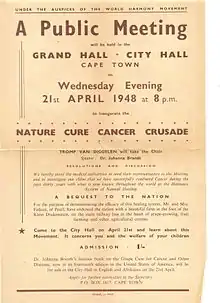 Johanna Brandt, a South African author, popularized the grape diet as a treatment for cancer from 1925. She published about twenty pamphlets on the subject of natural remedies for health problems with her book The Grape Cure, which is said to have been written after Brandt had cured herself of stomach cancer by following the diet.[8] The book was republished in 1989 as How to Conquer Cancer, Naturally, including an endorsement of Brandt's work by Benedict Lust, who is commonly referred to as "the father of naturopathy".