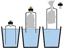 The cap is then packed with a smokable substance and screwed onto the bottle once it is immersed to its neck in liquid. While lighting the bowl with (preferably) a lighter or match, the bottle is gradually lifted until it is about to come out of the water or when the substance ceases burning. While the bottle is held in place, the lid is removed, the user's mouth is placed on the bottle opening, and the user inhales as the bottle is pushed back down into the water.[1][2] The cause of the smoke being expelled by the bottle's movement is the rise in internal pressure, created when the water volume increases; the smoke enters the lungs in a "smoother" manner than inhaling from a joint, blunt, or bowl by itself.[2][3] This will give the smoker a sudden dose with hardly any smoke lost, rather than the amount of smoke lost with joints and blunts.[4] However, once it is burnt and raised, the smoke can simply be breathed in while suspended in the chamber, with returning the bottle into the water to create additional upward pressure during inhalation essentially a matter of preference.