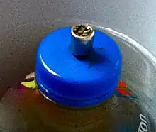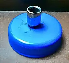 The construction of a bucket bong (or simply a "bucket") calls for a plastic bottle (about 2 litres (0.53 US gal)), a Hex Bit Socket used as the bowl, an aerator screen cut to fit the bowl, and a large bucket or other container into which both the bottle and a sufficient amount of water will properly go. The plastic bottle's base is cut off, and the bottle's cap has a small hole in the center which will eventually hold a bowl. The screen is placed inside of the bowl. The cut nozzle is threaded into the hole outside the cap.[1][2]