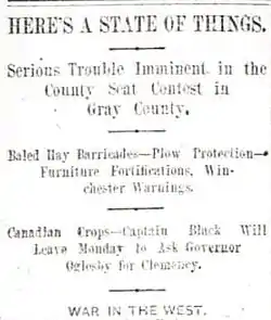 ![]() The headline of a Wichita Daily Eagle article warning of violence in Gray County following the county seat election in 1887. | |
