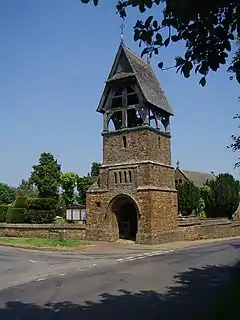 The Church of England parish church of All Saints was originally 13th century. The west wall of the nave has a recess containing a small bell cast by Henry I Bagley of Chacombe in 1673.[2] In 1863 the church was almost entirely rebuilt to plans by the architect William White,[3] who added a bell tower, separate from the church, built over the lychgate.[4][5] It is one of only three such bell towers in Britain to be so sited. All Saints' parish is now part of the Benefice of Shires' Edge along with those of Claydon, Cropredy, Mollington and Wardington.[6]