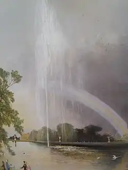 The fountain was described by English artist, E. Adveno Brooke, who visited and made a chronolithograph of the fountain in 1857: "As we stood admiring the beauty and tranquility of the scene, a bubbling sound of water, at first gentle and gathering force by degrees, broke out and we beheld the commencement of one of the most beautiful aquatic displays it is possible to conceive. This, the large fountain, is on a level with the surface of the lake, and composed of five jets, the central one throwing a column of water 150 feet high; the supply being obtained from a large reservoir on the hill, to which it is first pumped by the united action of two engines, each of thirty horsepower."[1] The water continued to jet for several minutes, until the water in the reservoir was exhausted.