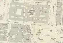Following an 1806 act of parliament the eastern portion of the south side of the street was demolished as part of an improvement scheme and in 1868 this part of Great George Street became one side of Charles Barry's Parliament Square.[2] The entire north side was demolished to form new government offices, constructed in two phases in 1898-1908 and 1911–1915, these are now known as Government Offices Great George Street, designed by J. McK. Brydon and Sir Henry Tanner. Tanner's design for the second phase included an early concrete frame design, whose strength led to the structure being the location for the Churchill War Rooms. Since 1940 the structure has housed most of the Treasury.[2]