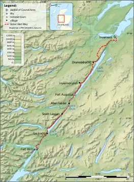 The Great Glen Way (Scottish Gaelic: Slighe a' Ghlinne Mhòir) is a long distance path in Scotland. It follows the Great Glen, running from Fort William in the southwest to Inverness in the northeast, covering 125 kilometres (78 mi).[2] It was opened in 2002,[3] and is designated as one of Scotland's Great Trails by NatureScot.[1] The Great Glen Way is generally walked from southwest to northeast to follow the direction of the prevailing wind.[2] It can be walked in 5–7 days,[2] or cycled in 2–3 days. The trail is maintained and improved by the Great Glen Ways partnership, which consists of Highland Council, Scottish Canals and Forestry and Land Scotland.[4] About 30,000 people use the path every year, of whom about 4,500 complete the entire route.[5]