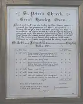 The tower has a ring of six bells.[10] Four of them — the present third, fourth, fifth and tenor bells — existed by 1552.[10] In 1641, Ellis I Knight of Reading recast what are now the fourth and fifth bells and cast a new bell (now the second bell),[10][11] increasing the ring to five. Late in the 1690s William and Robert Cor of Aldbourne, Wiltshire recast what is now the third bell.[10] Thomas Rudhall of Gloucester recast the tenor bell in 1774[11] and cast a new treble bell in 1775, increasing the ring to six.[10] In 1925, Gillett & Johnston of Croydon re-cast the treble and the third bells,[10][11] an event watched by King George V and Queen Mary.[12] Also in 1925 all six were re-hung in a new iron frame, which has capacity for the ring to be increased to eight.[10]
