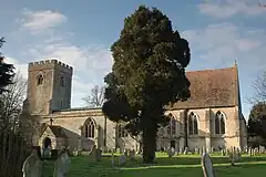 The Church of England parish church of Saint Peter dates from about 1200.[6] The three-bay arcades linking the nave with the north and south aisles are in a Transitional style from Norman to Early English Gothic, as is an external doorway that has been re-set on the west side of the bell-tower.[6] The chancel and its arch were built late in the 13th century,[7] and it retains all of its Decorated Gothic windows from that time.[8] In the 14th century each aisle was extended eastwards with a fourth bay,[6] and at the end of each aisle is a chapel with a squint into the chancel.[8] The northeast chapel is Perpendicular Gothic,[8] as are the bell-tower and the clerestory that was added to the nave.[6] The Gothic Revival architect Thomas Garner restored the chancel in 1897.[8] St Peter's is a Grade I listed building.[9]