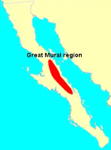 The Great Murals occur in the sierras of Guadalupe, San Francisco, San Juan, and San Borja in the central part of the Baja California peninsula. To the north and south their place is taken by other, less spectacular rock art styles. Within the Great Mural area as well, pictographs and petroglyphs belonging to other styles are present.
