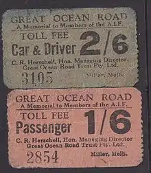 On 18 March 1922, the section from Eastern View to Lorne was officially opened, with celebrations. However, it was then closed from 10 May 1922 for further work, opening again on 21 December, along with tolls to help recoup construction costs. The charge, payable at the Eastern View toll gate, was two shillings for motor cars, and 10 shillings for wagons with more than two horses.[19]