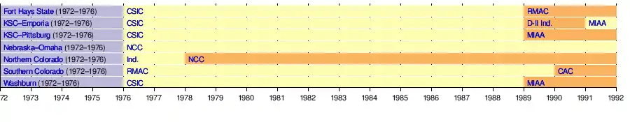 | Fort Hays State College[lower-alpha 1] | Hays, Kansas | 1902 | Public | 14,658 | Tigers | 1972–73 | 1975–76 | Central States (CSIC) (NAIA) (1976–77 to 1988–89) Rocky Mountain (RMAC) (NCAA D-II) (1989–90 to 2005–06) |