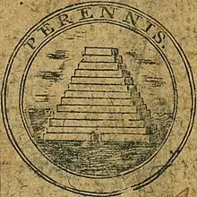 For the reverse, Barton used a pyramid of thirteen steps, with the radiant Eye of Providence overhead, and used the mottos Deo Favente ("With God favoring") and Perennis (Everlasting).[53] The pyramid had come from another Continental currency note designed in 1778 by Hopkinson, this time the $50 note, which had a nearly identical pyramid and the motto Perennis.[53] Barton had at first specified "on the Summit of it a Palm Tree, proper," with the explanation that "The Palm Tree, when burnt down to the very Root, naturally rises fairer than ever," but later crossed it out and replaced it with the Eye of Providence, taken from the first committee's design.[54]