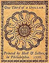 The motto was almost certainly taken from the title page of Gentleman's Magazine, a monthly magazine published in London which had used it from its first edition in 1731, and was well known in the colonies.[13] The motto alluded to the magazine being a collection of articles obtained from other newspapers, and was used in most of its editions until 1833. The motto was taken in turn from Gentleman's Journal, a similar magazine which ran briefly from 1692 to 1694. While variants turn up in other places (for example a poem often ascribed to Virgil called Moretum contains the phrase E Pluribus Unus), this is the oldest known use of the exact phrase.[46][47] Another source was some of the Continental currency issued earlier in 1776; these were designed by Franklin and featured the motto We Are One surrounded by thirteen rings, each with the name of a colony.[48][49] This design is echoed in the seal submitted by the first committee, and the motto was quite possibly a Latin version of this concept.[47]