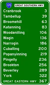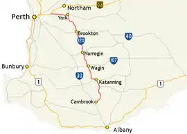 Great Southern Highway is a highway in the southern Wheatbelt region of Western Australia, starting from Great Eastern Highway at The Lakes, 50 km (31 mi) from Perth, and ending at Albany Highway near Cranbrook. It is the primary thoroughfare for this part of Western Australia and runs parallel with the Perth–Albany railway for its entire length. It is signed as State Route 120 from York to Cranbrook, and was first named in 1949,[1] although it was built well before that time.