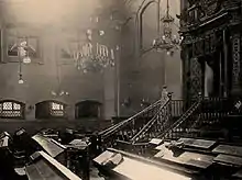 The two-tiered Holy Ark on the eastern wall was carved with gilded woodcarvings, representing plants, animals and Jewish symbols, with a double-headed eagle on top. It was approached by a twofold flight of steps, with iron balustrades, ascending from the right and the left. Hanging from the walls and ceilings there were numerous bronze and silver chandeliers.[1] The synagogue contained a valuable collection of ritual objects. The building was repaired in the 19th century.